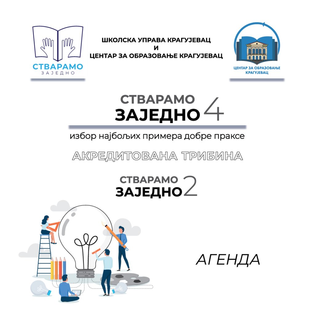Након успешно реализованог конкурса „Стварамо заједно 4“, за избор примера добре праксе, Центар за образовање Крагујевац подржао је акредитацију трибине „Стварамо заједно 2“, која ће се ове године реализовати непосредно, 11. марта 2023. године, с почетком од 10 часова, у Првој крагујевачкој гимназији.
