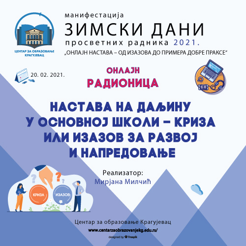 У организацији Центра за образовање Крагујевац у суботу, 27. фебруара 2021. године, у оквиру манифестације „Зимски дани просветних радника“ реализована је онлајн радионица „Могући облици индивидуалног рада ученика у онлајн настави – примери из праксе“.