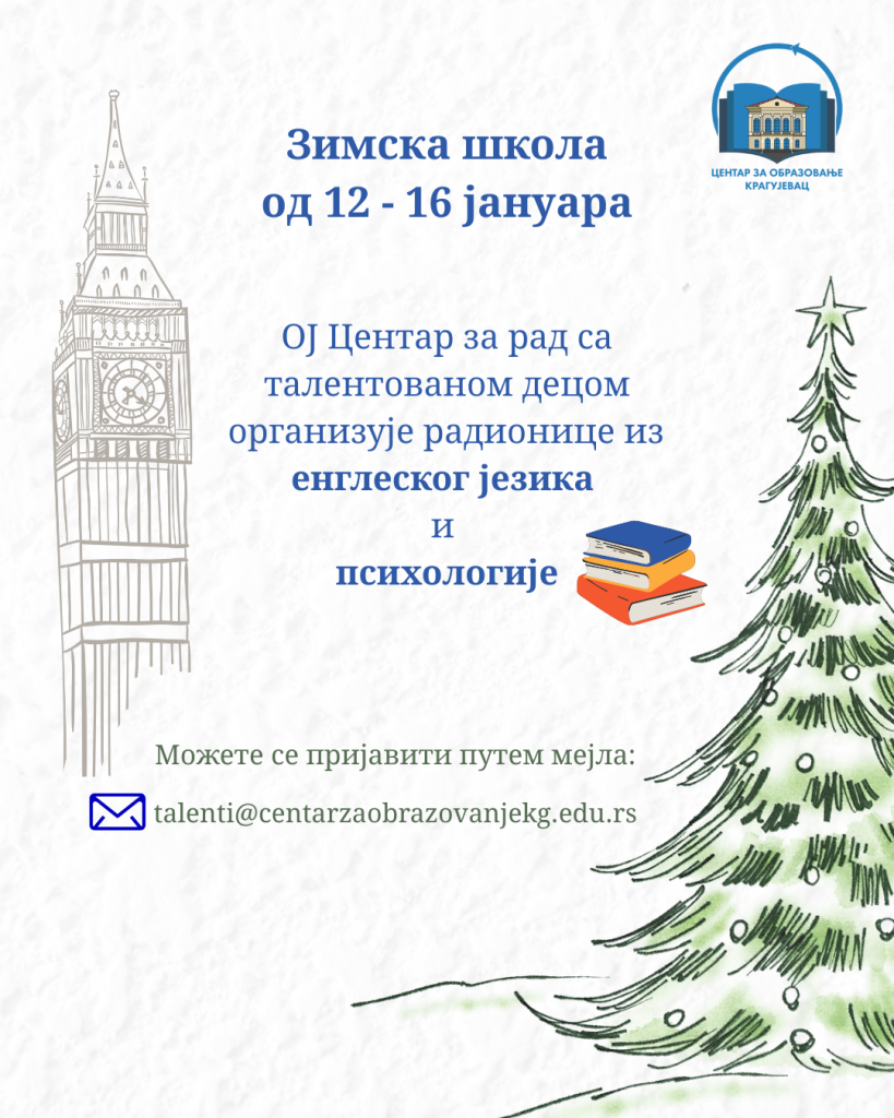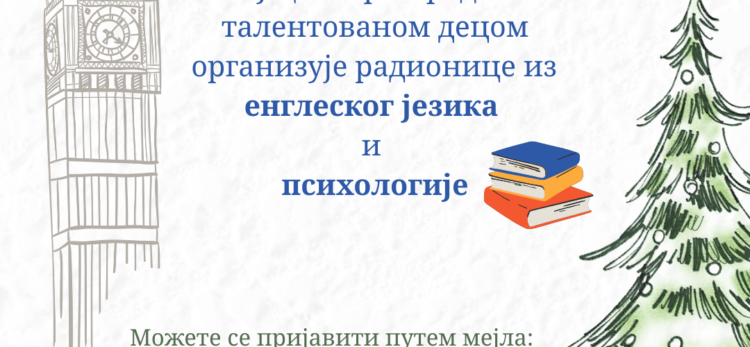 Центар за образовање, ОЈ Центар за рад са талентованом децом, организује занимљиве радионице из области енглеског језика и психологије, за ученике 7. и 8. разреда основних школа и ученике од 1. до 4. разреда средњих школа. Радионице ће бити реализоване у Америчком кутку, у Крагујевцу, од 12-16. јануара 2026. године. Учешће је бесплатно, а Центар за рад са талентованом децом обезбеђује материјал за рад. Пријава је могућа до попуне групе.